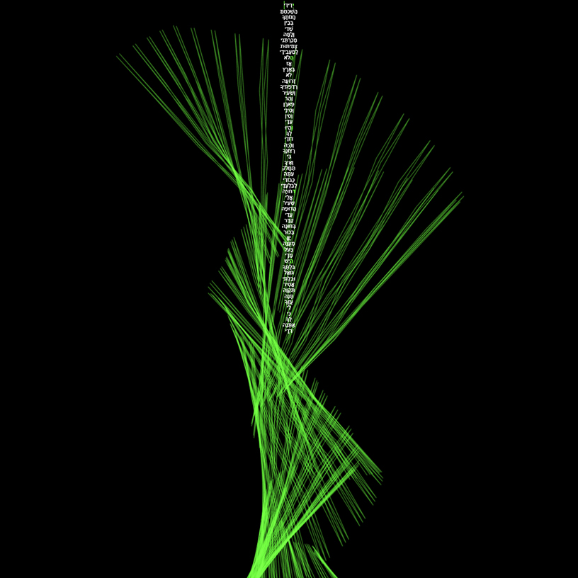 “Shifat Revivim Coding” (“Abundance of Rainfall”) is based on the text of Ibn Gabirol’s famous poem from the book “Tikkun HaGeshem”. Rabbi Shlomo Ben-Yehuda ibn Gabirol, also known as Ibn Gabirol, was a Spanish-Jewish philosopher and poet who lived in the 11th century (1021, Malaga, Spain – 1058). Tikkun HaGeshem (c. 1040) is one of his books of poetry. This collection of poems is part of Ibn Gabirol's wider oeuvre, which includes philosophical treatises, religious poetry and writings on ethics. “Tikkun HaGeshem“ is especially known for its spiritual and mystical themes, often exploring the relationship between humanity and the divine. In Ibn Gvirol's hymn “Shifat Revivim“, streams of rain are a symbol of salvation. Each verse of this hymn begins with a Hebrew letter forming an acrostic – the words SHLOMO CHAZAK (SOLOMON THE MIGHTY). The blue streams in the video connect the letters of the ACROSTICS and “draw” a complex graphic system reminiscent of falling rain.