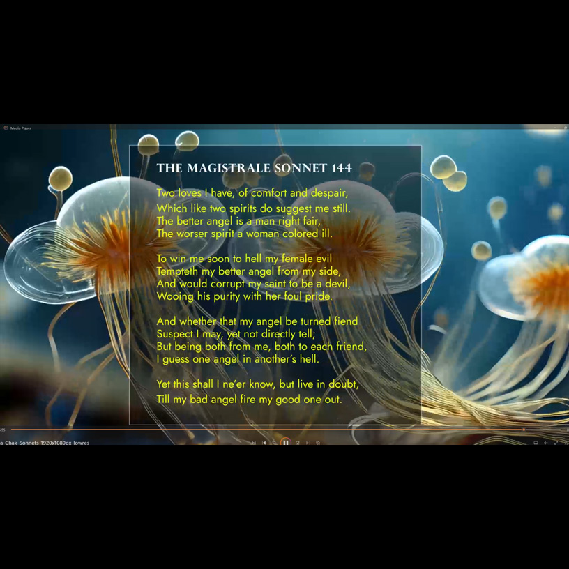 For the Magistral, I selected Shakespeare's Sonnet 144, which depicts the poet’s entangled relationships with a dark-haired woman and a fair-haired young man—allegories of the eternal human struggle between the forces of good and evil.